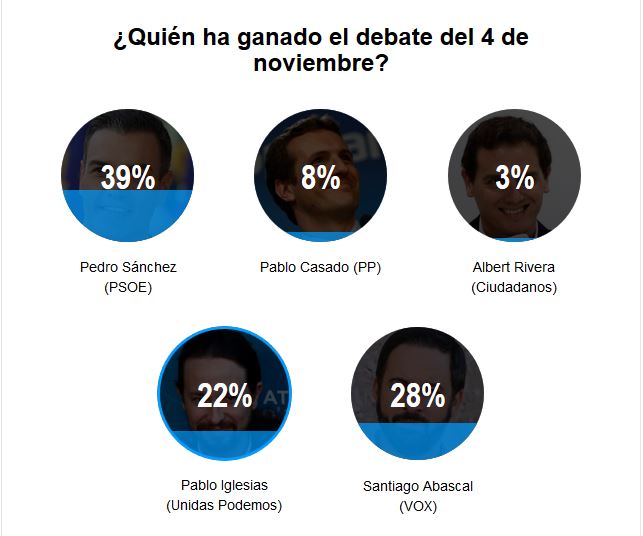Aún recuerdo cuando los medios de comunicación mas o menos coincidían en sus vaticinios y no dependían de grupos empresariales partidistas, pero lo de este ultimo debate de presidenciables es un evidente ejemplo de hacia donde miran los intereses de cada uno y que por muchos debates que puedan hacer parece ser que los que quieren coger el sillón de presidente de este país están mas preocupados en mentir con las cifras, desviar la atención hacia Cataluña como si no existieran 16 comunidades autónomas mas. Pero bueno lo que interesa hoy es una muestra de las encuestas sobre el debate y de como cambian según el medio al que pertenecen: